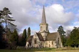 Notes on Church: | The cruciform church (with no aisles) was built in 1849, designed by the architect Benjamin Ferrey. It has a memorable octagonal central tower and slender shingled spire, as well as a stunning location on the edge of Penn Wood. The interior is tall, especially at the Central Crossing. The church has always been strongly connected with the Howe (Curzon) family, the church and churchyard have many family monuments. More... The interior walls have a lot of dark wood panelling, brought to Penn Street in the 1920s from Gopsall Hall in Leicestershire, which had been a family seat for 150 years. The Western wall is dominated by a very large painting which is a copy of "The Transfiguration" by Raphael, which is in the Vatican Museum. The Penn Street copy was previously in the Curzon Street Chapel in Mayfair. |