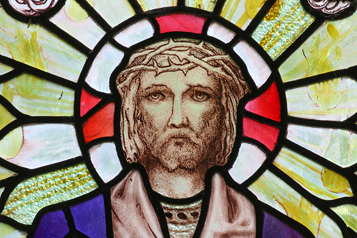 Centre light: Close up of Christ's head. In this window of fairly subdued colours, the red arms of the nimbus cross stand out very brightly.