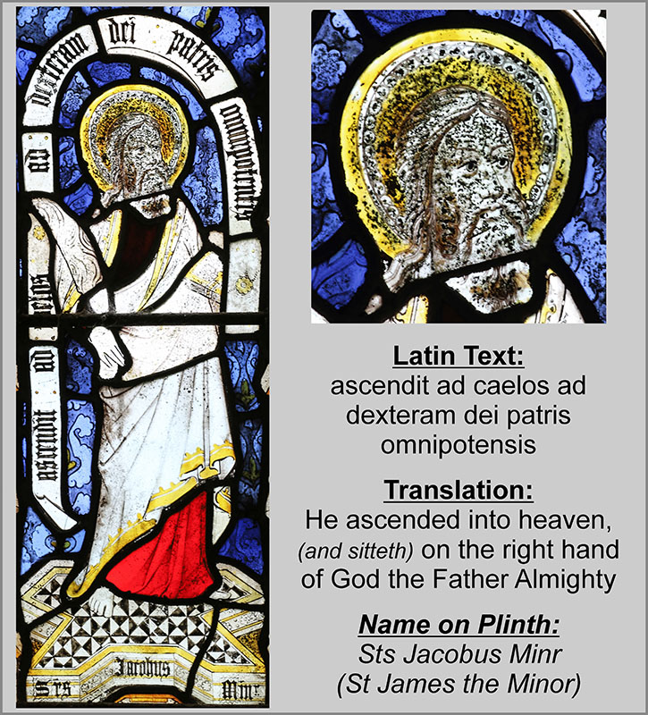 Lower tier, light 1: St James the Minor, or the Less - full view, head, and Creed text.