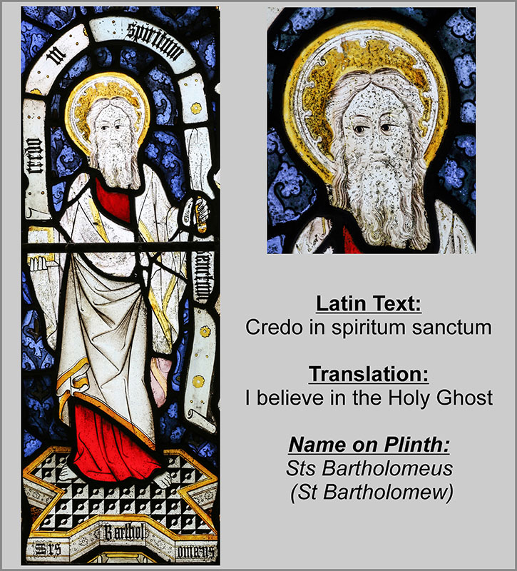 Lower tier, light 3: St Bartholomew holding a knife, by which he was martyred - full view, head, and Creed text.
