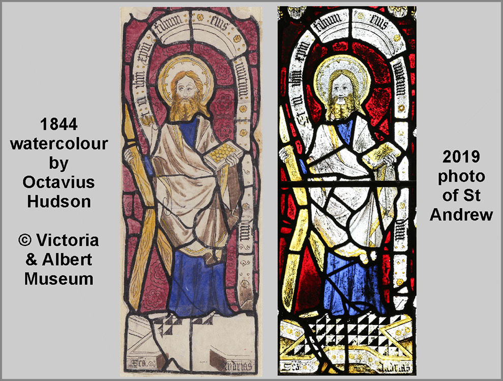 Top tier, light 2: St Andrew - Comparison of 1844 drawing and 2019 photo. The Creed text is the same in both.