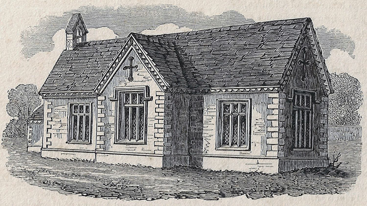 Drawing of the original 1825 church, showing the E window on the extreme right, with 4 lights in each tier, although that might be a mistake. The same wall was opened up in the 1870s to form the Arch leading into the new Chancel. The glass from this window is now in window 10 in the N Transept.