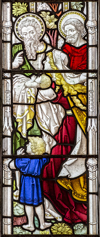 RH light: Two more Disciples (presumably), a woman with very long golden hair holds up a baby, and a child stands in front.
