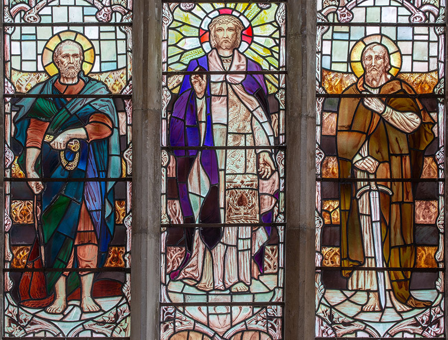 Main Lights: Figures of St Peter, Christ blessing, and St Paul. Notice how the stemwork continues down both sides of the figures, then joining up below their feet.
