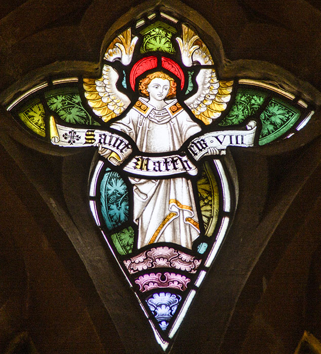 Top of Tracery: An angel holds a scroll saying "Matthew 8". Verses 5-13 tell the Miracle of Healing the Centurion's Servant.