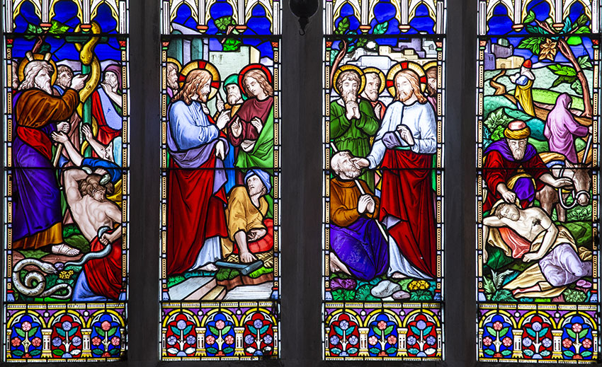 4 main scenes, all showing parables about healing, appropriately in memory of a Doctor in the town.