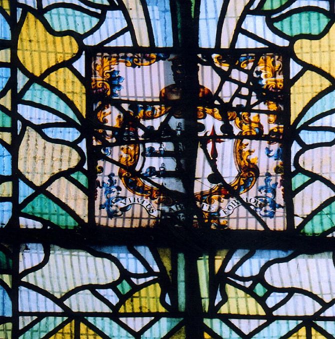 "Geometric pattern of pale green, yellows and blues,""~ Bertie Coat of arms 18th c.inserted"
