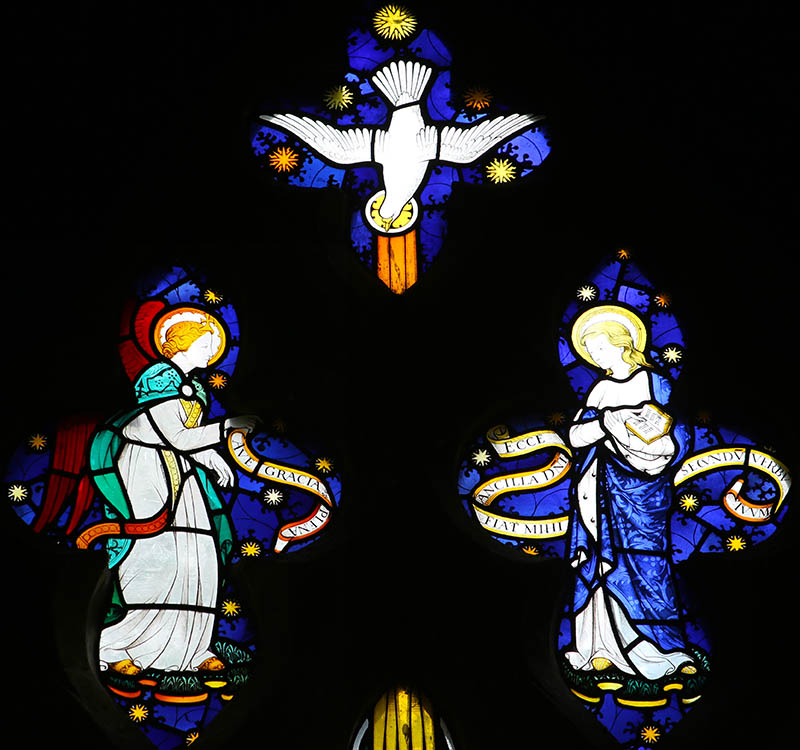 Tracery: Annunciation, Dove (at top), Archangel Gabriel (on left), and Virgin Mary (on right)