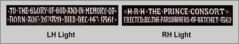 Inscription at base of 2 lights (to HRH the Prince Consort)