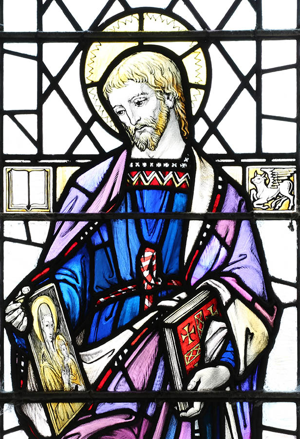 St Luke looks at his first icon painting of the Virgin and Child. His symbol of a winged ox is on the right