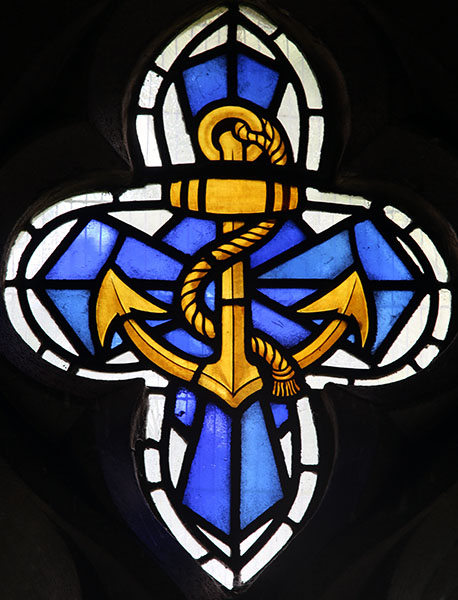 Tracery Top Light: An anchor, a symbol of St Nicholas that shows his close association with ships and sailors.