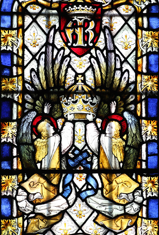 Top of Centre light: Two Angels with large wings are holding up a large crown. Above is a red shield with the letters MR, themselves bearing a crown. This is one of many symbols for the BVM.