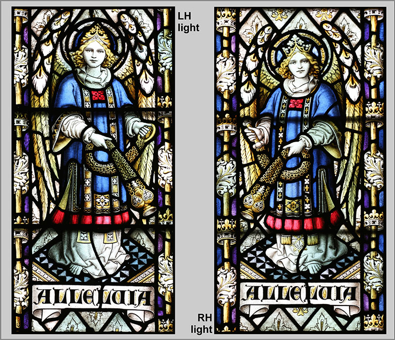 At the top of the outside 2 lights (above Saints Joseph and Elizabeth) are the symmetrical figures of 2 censing angels.