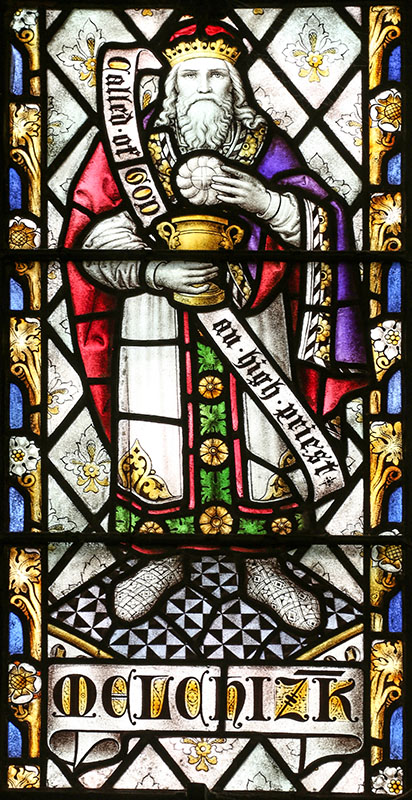 LH light top: Melchizedek (abbreviated to Melchizk). He was a Hebrew priest and King of Salem, his quoutation is from Genesis 14:18. This scene is narrower than all the others as it is an opening window.