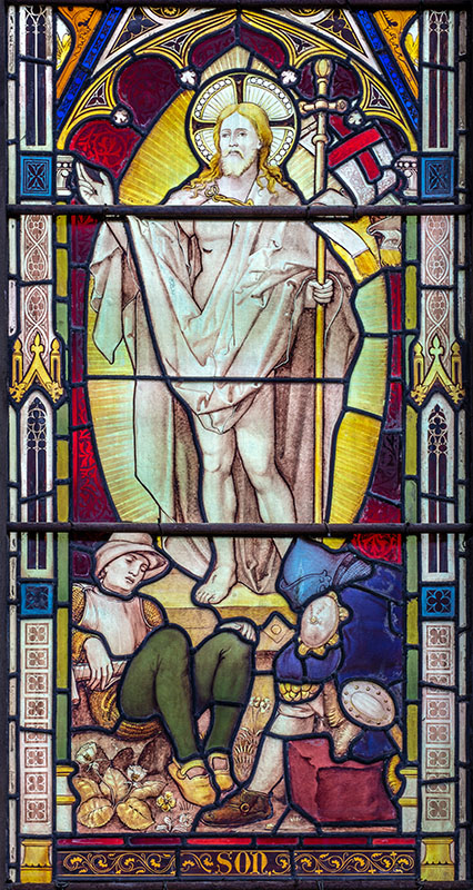 Centre light: The Son (or Redeemer) showing the Resurrection.