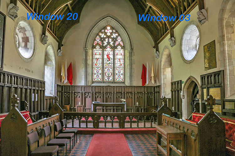 The high round windows, 03 on the right, and 20 on the left, are a matching pair with plain glass.
