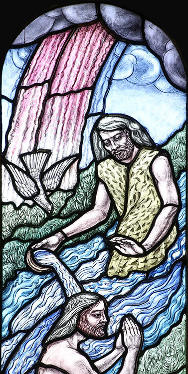 Light 5, top: The Holy Spirit is beside John, who is baptising Jesus.