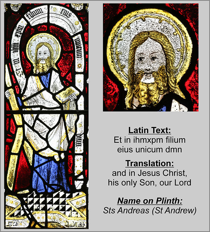 Top tier, light 2: St Andrew with his saltire or diagonal cross - full view, head, and Creed text. (also see another below)