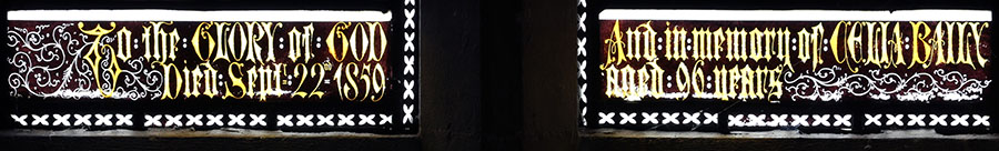 Base of window: Inscription to Celia Baily, died Sept 22 1859 aged 96 years.