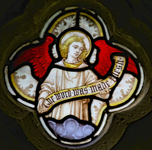 Tracery: An angel holds a scroll with "The word was made flesh" (John 1:14).