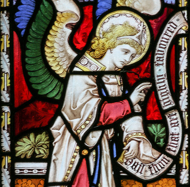 LH light: Archangel Gabriel with a scroll saying "Hail thou that art highly favoured" (Luke 1:28)