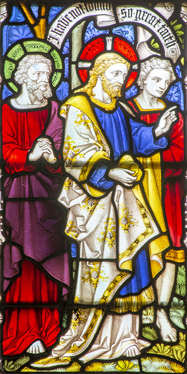 LH light: Christ with his hand raised towards the Centurion. He is with 2 other figures, one could be St Peter. Text is "I have not found so great faith" [Matthew 8:10].