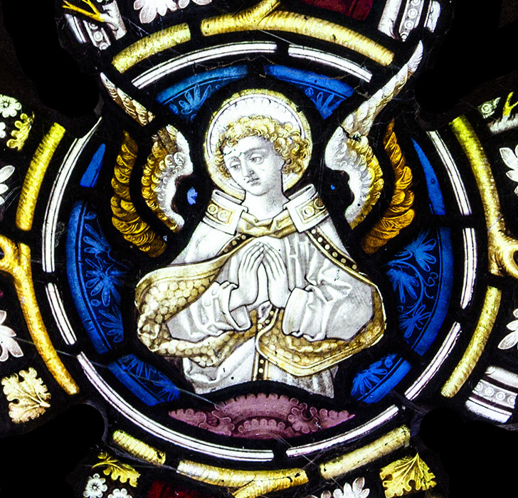 Tracery: The Angel emerging from a cloud, holding hands in prayer.