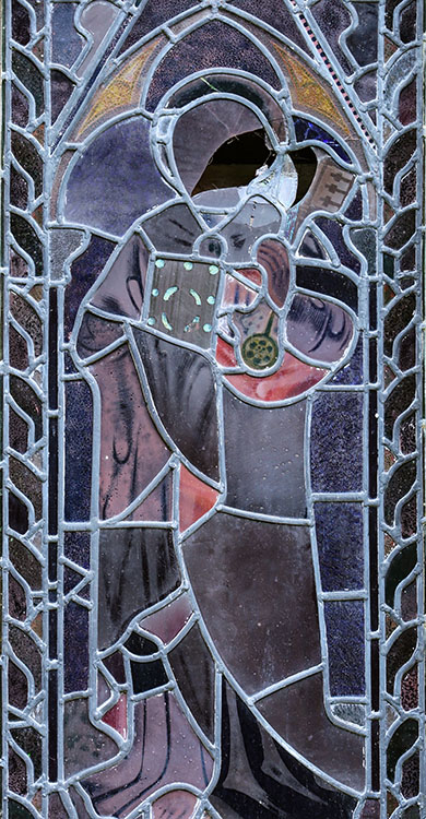 Closer look at St Peter where we can see that despite losing his face, he is still holding a book and his keys.