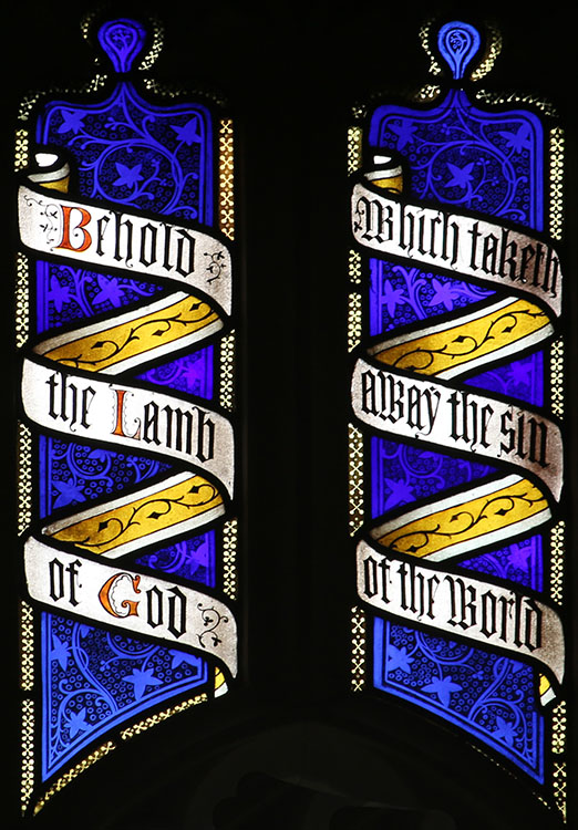 Tracery text from John 1:29 - "Behold the Lamb of God, which taketh away the sin of the world".