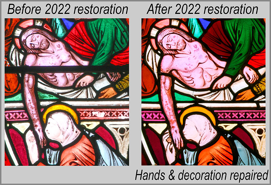 Lower Scene: Comparison of details in 2016 and 2022 to show restoration work.