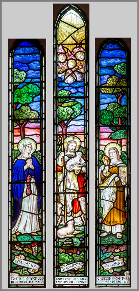 For illustrative purposes, this shows the glass from the 3 lancets brought together. They show the Blessed Virgin Mary, The Good Shepherd, and St John.