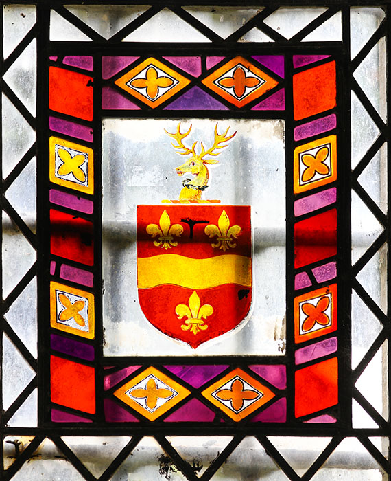 LOWER RH LIGHT, c1790: - Shield and Crest of John Hicks of Bath, who bought Bradenham Manor in 1787, he died in 1825.