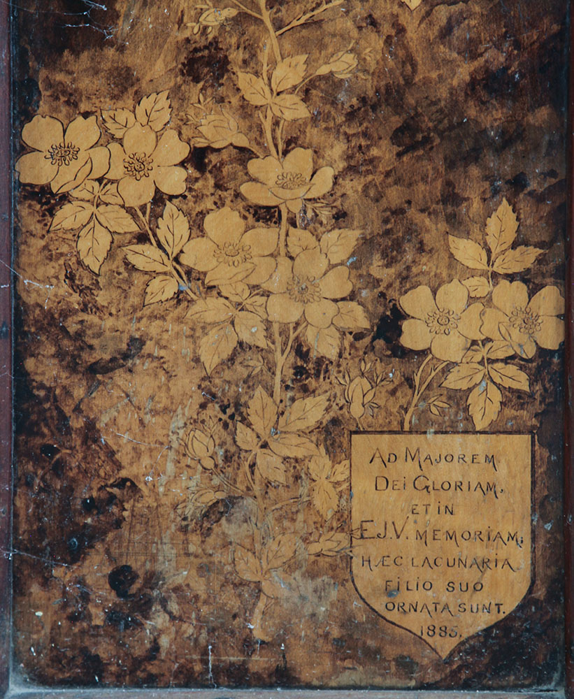 | Another Choir Stall recording that the decorative panels of 1885 are in memory of "EJV". | |||