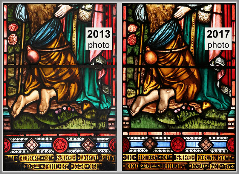 RH light: Comparison of 1865 glass (photographed in 2013) with restored glass of late 2016, following breakage of window in early 2016
