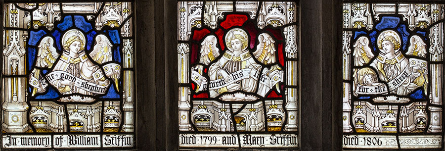 Base of window: Three demi-angels hold ribbon scrolls which make up a complete text.