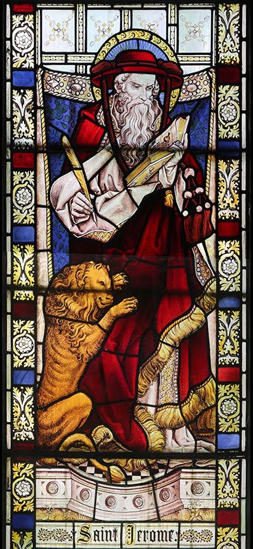 St Jerome was a 4th century priest, best known for translating the Bible into Latin. At his feet is his symbol of a lion.