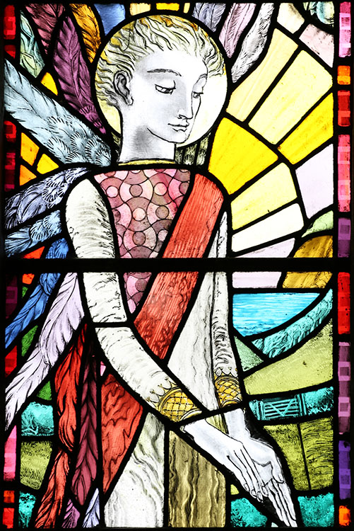 LH light: A close-up shows the Angel's wings are made of different coloured feathers. In the background is the coast.
