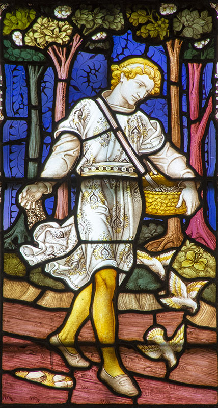 LH scene: The Sower sows seeds from a basket, and 3 birds are flying down for them.