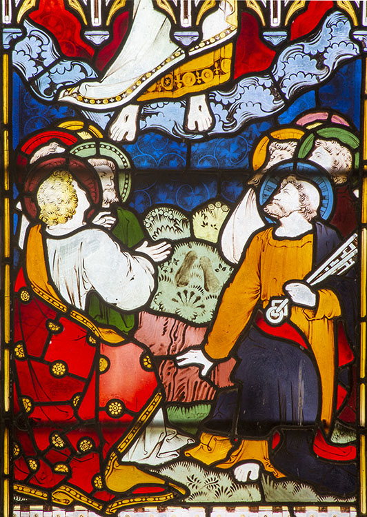 RH light: The Ascension, Christ's feet are in the clouds, and the disciples are looking up from below, with John and Peter at the front.