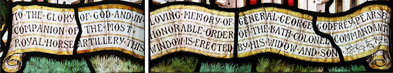 Both lights: Inscription at base of windows, in memory of General Pearse