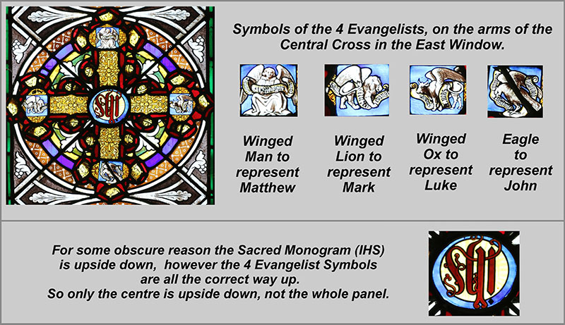Centre light: Details of symbols of the 4 evangelists, and the central IHS, all within the Cross.