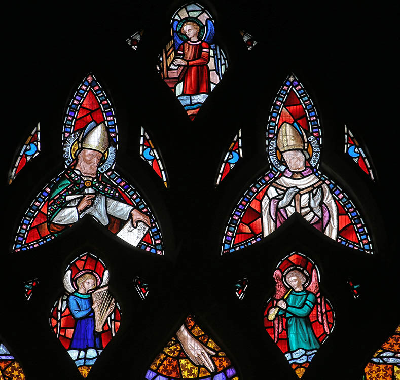 Tracery: including St Austin (Augustine), St Ambrose, and Angel musicians, looking down at the Te Deum scene below