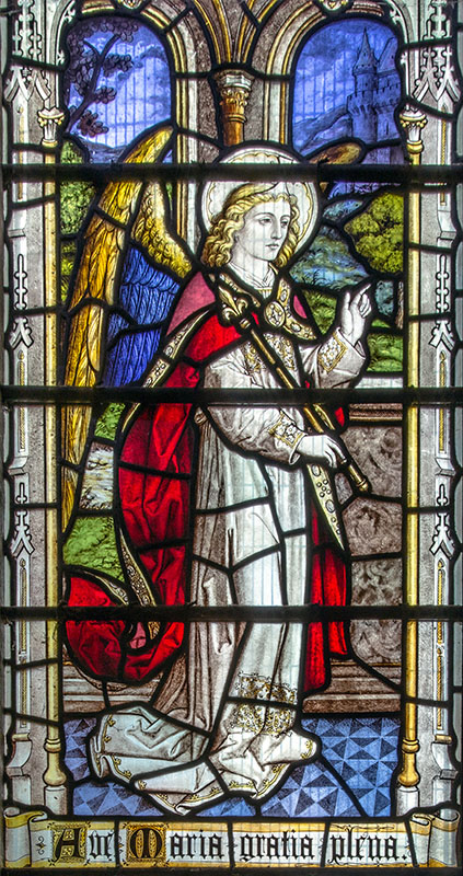 LH light: The Archangel Gabriel tells Mary that she will become the mother of Jesus. "Ave Maria, gratia plena" means "Hail Mary, full of grace".