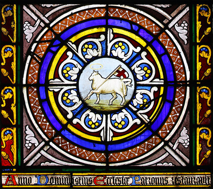 Centre light: Base, with The Lamb of God, and the middle of the inscription.