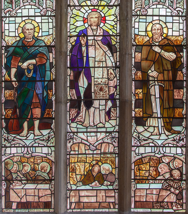 Three Main Lights: Figures of St Peter, Christ blessing, St Paul, and scene of The Last Supper at the base of the window.