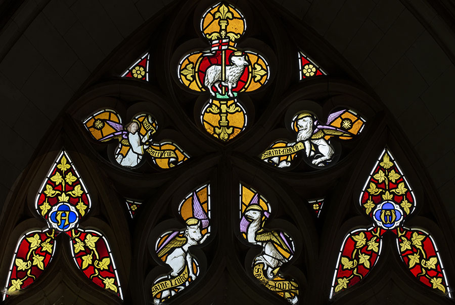 Tracery Lights, including the Lamb of God, the Symbols of the Four Evangelists, Alpha and Omega.