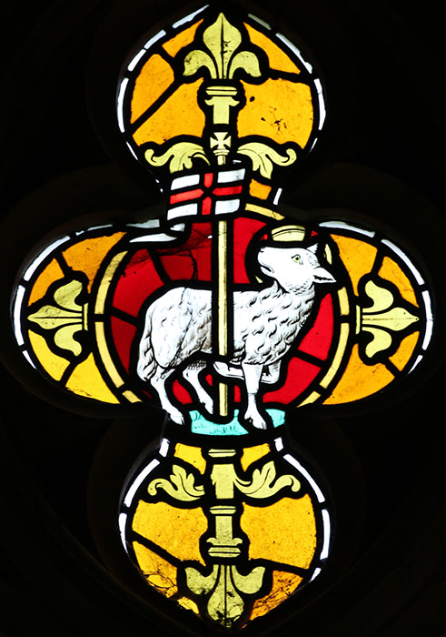 Tracery: Agnus Dei (Lamb of God) holding the Banner of Victory, and surrounded by 4 fleur-de-lys.