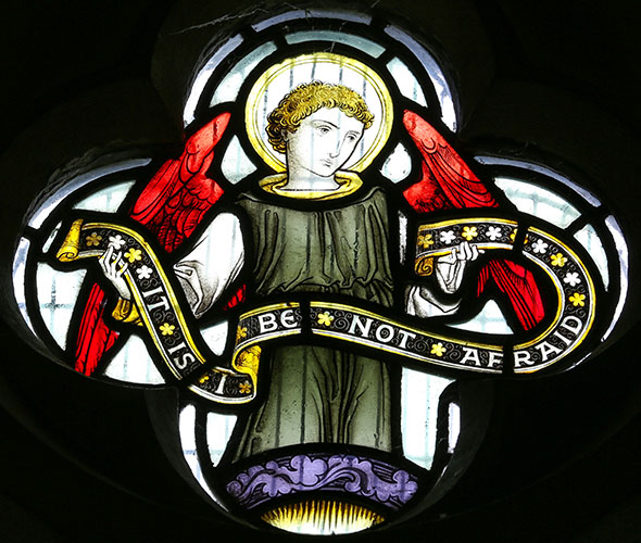 Tracery: an Angel holds a Scroll with Jesus' message: "It is I be not afraid", from Matthew 14:27.