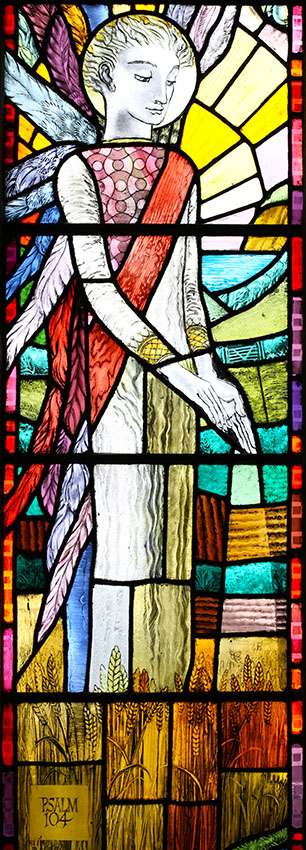 LH light: The Angel is shown bringing light and warmth to the earth, shining down on a crop of wheat.