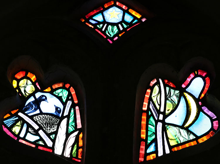 Tracery: The scene with the apple tree continues into the sky in the tracery, where blackbirds have made a nest on the left.